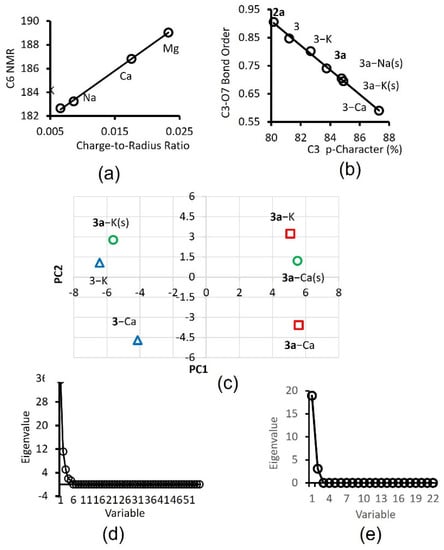 (a) C6 NMR of 2 vs. cation charge-to-radius ratio in methanol, (b) C3-O7 bond order vs. C3 p-character for chromophore models, (c) PC2 vs. PC1 score plot, (d) computational Scree plot, and (e) experimental Scree plot.