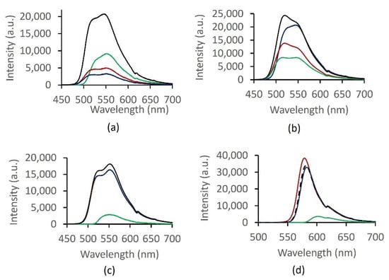 Emission intensities with Ca2+, K+ and Mg2+; (a) 1, (b) Fl, (c) Fl-OH and (d) Rh. Color: black (Ca2+), red (K+), blue (Mg2+) and green (fluorophore).