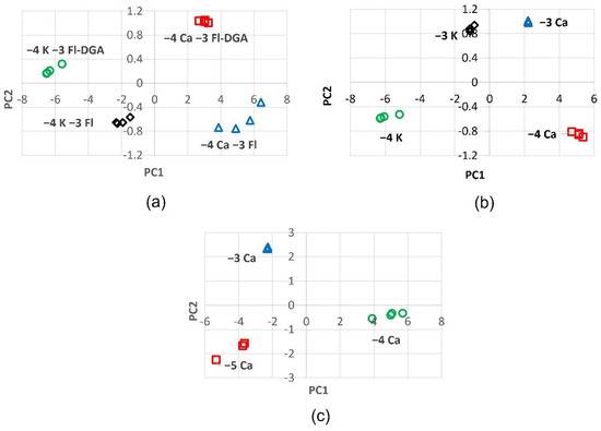 The first case of interest is the determination of 1 × 10−4 M (0.1 mM) of Ca2+ and its separation from 0.1 mM potassium (Figure 8a). Moreover, it is important to compare the score plot of Fl-DGA with that of the parent fluorescein compound (Fl). It is noteworthy that the four possible clusters, from four sets of samples, afford distinct clusters in dedicated quadrons. Fl-DGA separates 0.1 mM Ca2+ and 0.1 mM K+ into the Q2 and Q1 quadrons, respectively. Both cations exhibit tight clustering near (3,1) and (−6,0.2) coordinates, respectively. Fl separates the two cations at 0.1 mM, less effectively into the Q3 and Q4 quadrons. The 0.1 mM Ca2+ scores in Fl fluorophore are also poorly clustered, horizontally spread from 4 to 6 along the PC1 axis. These results confirm the photophysical observations that indicate improved responses with Fl-DGA and Ca2+.