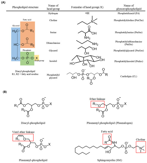 Structures of phospholipids. (A) Name of the phospholipid according to the change of the head group in diacyl-phospholipid. (B) Structures of diacyl-phospholipid, ether lipid, and sphingolipid.