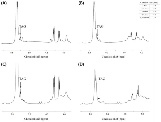 Additionally, the composition of neutral lipids was investigated. It is thought that the lipids extracted from each sample contain fewer neutral lipids than phospholipids because the total weight percent of phospholipids (i.e., PLs (w/w %)) presented in Table 2 is much higher than the weight percent of others containing neutral lipids. As a result of analysis through 1H-NMR, the component of neutral lipids that showed a clear peak and could confirm the presence was triacylglycerol (TAG), while it was difficult to identify the peaks corresponding to di- and mono-acylglycerol (Figure 4).