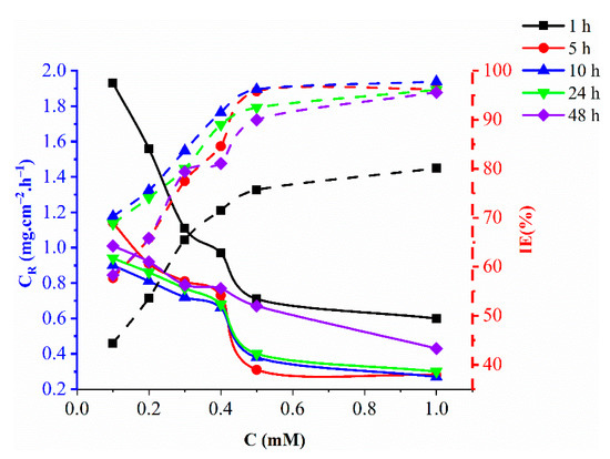 Mild steel was exposed to 1 M hydrochloric acid in the presence of the inhibitor (0.1 to 1.0 mM) for 1 h to 48 h at 303 K to investigate the effect of exposure time on the corrosion inhibition efficiency of the nicotine hydroxide derivative (Figure 3). With the increase of exposure up to 10 h, the inhibition efficacy increases rapidly, slowly decreasing thereafter from 10 to 24 h, then decreases faster from 24 to 48 h. The increase in nicotine hydrazide derivatives (due to an increase in concentration) adsorbed on the surface of mild steel with increased exposure time increases the inhibition efficiency. However, as more inhibitor molecules are adsorbed on the mild steel surface, the adsorption density of the inhibitor increases dramatically, allowing for bonding between inhibitor molecules and iron atoms on the mild steel surface via van der Waals force (physical adsorption) and coordination bonds (chemical adsorption). Some inhibitor molecules may leave the surface, thus reducing the effective area covered by the inhibitor and reducing the inhibitory efficacy. The stability of the inhibitor layer adsorbed in the presence of 1 M HCl solution is evidenced by the relatively high inhibition efficiency observed during the long immersion period.