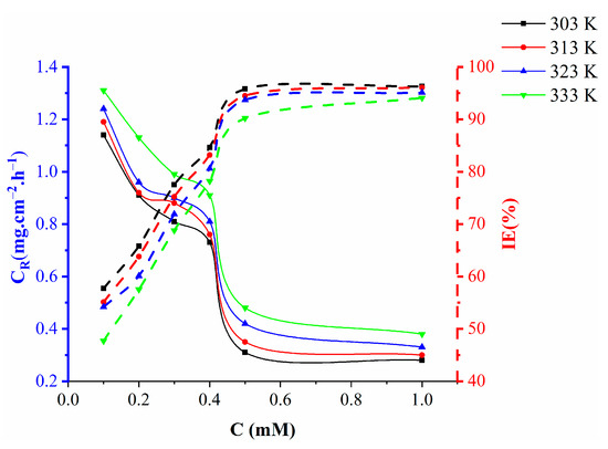After 5 h of immersion at different temperatures (303–333 K), the corrosion inhibition of mild steel in 1 M HCl in the presence of different concentrations of the tested inhibitor (0.1–1.0 mM) was examined using the mass reduction technique. The rate of corrosion increased with temperature at the same inhibitor concentration (Figure 4) and anticorrosion efficacy decreased with increasing temperature from 303 to 333 K. The tested inhibitor was most effective at normal temperature. Physical adsorption is suggested by a decrease in inhibitory effectiveness with increased temperature increase at all concentrations. Additionally, the surface of mild steel loses inhibitor molecules at high temperatures due to desorption.