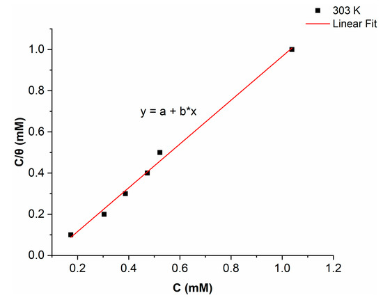 Understanding the interaction between the inhibitor molecules and the metal surface is made easier by the adsorption isotherm. The surface coverage (θ) values for the nicotinehydrazide derivative, which were collected by weight loss methods, were used to assess which isotherms best suit the data. The inhibitor molecules attach to the surface of the metal either physically or chemically, so various adsorption isotherms (Temkin, Freundlich, and Langmuir isotherms) were used to analyze the adsorption process. The regression coefficient (R2) for the nicotinehydrazide derivative of 0.99713 suggested that the Langmuir adsorption isotherms fit the data very well, with the calculated slope and intercept values for the Langmuir isotherm of 1.06301 ± 0.04035 and −0.09668 ± 0.02238 respectively. Figure 5 depicts the Langmuir adsorption isotherm plot between C/θ and C, and the equation (Equation (1)) is as follows: