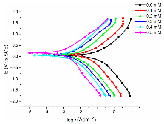 Figure 7 exhibits the polarization curves for the mild steel samples in 1.0 M HCl solution in the absence and presence of various concentrations of nicotinehydrazide derivative at 303 K. Table 1 presents the experimental findings for the corrosion current density (), corrosion potential (), and inhibition efficiencies, with the anodic Tafel slope () and cathodic Tafel slope (). The programme presents the Tafel fit strategy, which uses a nonlinear chi-square minimization to fit the data to the Stern–Geary equation.