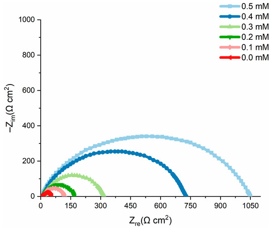 Electrochemical impedance spectroscopy (EIS) was used to determine the inhibition efficiency of the tested inhibitor in inhibiting corrosion. The experimental results for mild steel corrosion at 303 K, in the absence and presence of an inhibitor, are shown in Table 2 and Figure 8 shows the Nyquist plots. The addition of nicotinehydrazide derivative significantly increased the overall resistivity of mild steel in the HCl solution. Two loops were observed in the Nyquist plots: one loop in the high-frequency band (HF) and one loop at an intermediate frequency (MF), with less inductive effect at lower frequencies (LF). The HF and MF loops are attributed to the EIS instrument limits at high frequencies with low resistance and charge-transfer processes, accordingly. Accordingly, the inductive behavior observed in the LF region is caused by the relaxing process of the corrosion product adsorption or the inhibitor molecule adsorption onto the test surface in HCl in the absence/presence of the inhibitor, respectively [21].