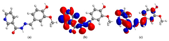 The optimized structure (a), HOMO (b) and LUMO (c) of the tested corrosion inhibitor.