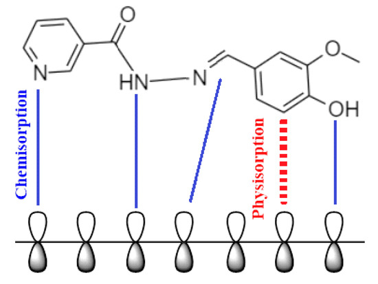 Chemical adsorption is indicated by values of ranging between and greater negative values, whereas electrostatic interaction, or physical adsorption, is indicated by values of about or less negative than [16,17]. The value for the nicotinehydrazide derivative of suggests that there are two different types of adsorption, chemical and physical.