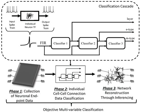 In this paper, we propose a new objective multi-variate classification based on the morphology, activity and communication of neurons using supervised machine learning algorithms. The main strengths of our work include (i) the characterisation of neuronal information transfer using classical Shannon mutual information theory and spike delay estimation, and (ii) a cascade of three different classifiers arranged to perform classification and inference of biological neuronal networks using multiple variables with the same training data. We depict our proposed system in Figure 1. First, in Phase 1, we collect end-point neuronal voltage data through simulations of cortical neuron networks. For that, we developed new simulation support libraries for integrating large cortical circuit formation, using the Python language to link the validated computational models of the Blue Brain Project and the NEURON tool, called Neurpy and NeurGen. We derive finite impulse responses (FIR) models from individual neuron transfer functions (TF) used in our mutual information and spike delay estimation analysis. In practice, we can assume that the measured signals are available (as they can, e.g., be measured by multi-electrode array technology in-vitro or by invasive brain–computer interfaces in-vivo), even though its utility in those scenarios must be verified by further studies. Then, in Phases 2 and 3, we propose a cascade of supervised classification algorithms using features from our information and communication analysis based on various forms of cortical networks, from generic networks motifs to existing ones found in biology, as discussed in [10]. We investigate the classification and inference of neuronal cells and circuits, especially at an inter-cortical layer scale and with a large variety of cell-types (40+), progressing the field towards the classification of more complex cortical circuits. For that, we extracted the simulated data of 10,000 network topology combinations with five layers, 25 cell m-types, and 14 cell e-types. We applied the data to a cascade of different classifiers (including Support Vector Machine (SVM), Decision Trees, Random Forest, and Artificial Neural Networks) analysing accuracy, recall, precision and F1 score, and also identifying the specific cell type (and sub-group types). The classification and the inference are performed based on the conventional training/testing data split method (70–30 ratio), where the testing data are compared to the training data. Finally, we reconstructed the cell-types in a known topology based on end-point measurements taken around the network. We achieved accuracies of up to 70% and inference of biological network structures using network tomography reached up to 65% of accuracy.
