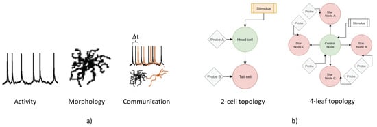 The visual representation of the (a) data types used in our paper (activity, morphology and communication) and (b) the topological configurations (2-cell topology and 4-leaf topology).