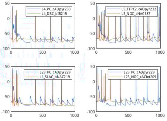The analysis of the communication network details of a synaptic connection was done through the simulation of a set of simple 2-cell networks (n = 22,500). This results in the production of sets of voltage data for each simulation, one from the head-cell and one from the tail-cell. As the output of one cell is acting as the stimulus to the other, the spike trains from the simulations tend to be correlated. The output plots from a few of these simulations are shown in Figure 4. In these sample plots, the source–destination spike correlation is clear, as a spike in the pre-synaptic cell often results in a spike in the post-synaptic cell. In addition, the plots indicate a slight delay between the source and event spikes.