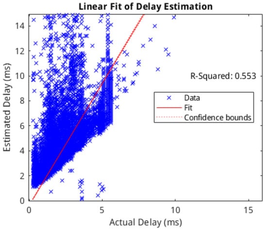 Correlation of delay estimate vs. actual delay with least-squares linear model and associated R-squared score.