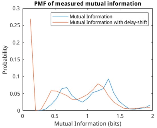 PMF plots of calculated mutual information for the measured spike-train (black) and the delay-estimate shifted spike-train (orange).