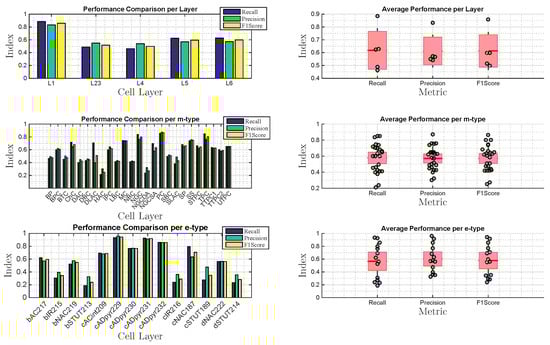 Performance comparison between layers, m-type as well as e-type present also variability for metrics such as recall, precision and F1 score. In Figure 10, while we show an average close to 0.6 of all metrics for all layers, we can observe that classifying cells in layer one is often easier. Many reasons might be thought for that, but they all boil down to the easy propagation of spike signals in that layer. The variability in the performance is higher when considering the comparison of m-types and e-types. Our results show that the link between structure and properties of neurons presents different levels of communication, which can be classified. While in some cell types this detection is still poor (like m-type or e-type), in other cells, it presents really high classification performance (like m-type or e-type).