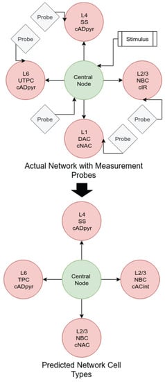 As the SVM classifier had the best performance in comparison to the other classification models, this is the model that was applied in the reconstruction of the 4-leaf star networks. The process here was similar to the previous experiments: several unique networks were generated, simulated, and their data-points measured and analysed. In this case, the networks generated were of the 4-leaf star topology type previously discussed. The central node was constrained to be of the same cell type used in the training of the models (layer 1, DAC m-type, bNAC e-type), while the star cells were varied. For each measurement from the soma-membrane of a star node, the characteristic filter was estimated using the same process discussed previously, and the filter coefficients were passed through the pre-trained classifiers. The performance results of the topology reconstruction are shown in Table 5. Here, we tabulate the accuracy of the classifier chain in estimating layer, m-type, and e-type groups, as well as the “whole-cell” classification accuracy. We define whole-cell accuracy as the cases where all three sub-groups were correctly estimated. The factor of improvement for the whole-cell prediction is significantly higher than for any other group, while the sub-group accuracy is quite similar to that in the 2-cell networks. Figure 11 shows a sample reconstruction of a 4-leaf network from probe measurements. The top part of the figure represents the network as it was simulated, with probes at the network endpoints, probe in the central node, and a stimulus on the central node, along with the actual cell types of the leaf nodes. The bottom part of the figure shows the reconstructed topology based on the cell-type estimations from the SVM classifier chain. The top figure is the original network topology, and the bottom one is the predicted network topology.