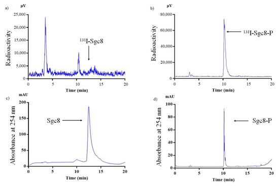 HPLC chromatogram analysis of Sgc8 (c), Sgc8-P (d), and the oligonucleotides after the treatment with classical radioiodination protocols (a,b).