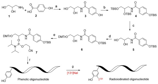 The synthesis of phosphoramidite 7 started with commercially available 3-aminopropane-1,2-diol (compound 1, Scheme 1) and 4-hydroxybenzoic acid (compound 2), the coupling of which provided the product 3 in a 75% yield under the activation of 3-(3-dimethylaminopropyl)-1-ethylcarbodiimide hydrochloride (EDC.HCl) and N-hydroxysuccinimide (NHS). Considering the difficulty in selectively protecting the phenolic hydroxyl group, all the hydroxyl groups were protected with the silyl group by the reaction with tert-butyldimethylsilyl chloride (TBSCl), giving compound 4 in a 70% yield. Selective desilylation of compound 4 to reveal the alkyl hydroxyl group was accomplished by the reaction with iodine in methanol, and diol 5 was thus prepared smoothly in an 85% yield. Following standard procedures, compound 5 was converted into phosphoramidite 7 in two steps, which is a standard molecular element for the introduction of phenolic functionality into oligonucleotides by solid-phase synthesis. From commercial materials 1 and 2, phosphoramidite 7 was efficiently prepared in 5 steps in mild reaction conditions with a 25.7% overall yield (see the Supplementary Materials for the detailed procedure and spectra of the compounds), the synthesis of which is readily scaled up for commercialization to facilitate the radioiodination of oligonucleotides.