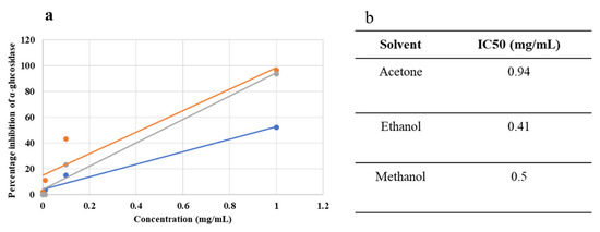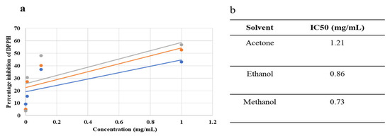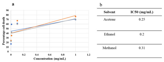 Dose–response curve (a) and IC50 values (b) of acetone-, ethanol-, and methanol-based extracts.