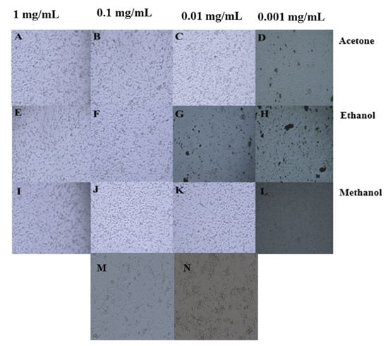Antiproliferative activity of Coronopus didymus against HepG2 cells. (A–D) represent treatment with acetone-based extracts at a concentration of 1 mg/mL, 0.1 mg/mL, 0.01 mg/mL and 0.001 mg/mL, respectively. (E–H) depict treatment with ethanol-based extracts at a concentration of 1 mg/mL, 0.1 mg/mL, 0.01 mg/mL and 0.001 mg/mL, respectively. (I–L) are treatment with methanol-based extracts at a concentration of 1 mg/mL, 0.1 mg/mL, 0.01 mg/mL and 0.001 mg/mL, respectively. (M,N) represent negative and positive control, respectively.
