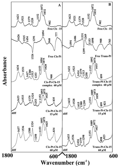 FTIR spectra in the region of 1800–600 cm−1 of hydrated films (pH 5–6) for chitosan–15 kD with cis–Pt (A) and trans–Pt (B) with chitosan (60 µM) and its Pt conjugates with difference spectra (diff.) (bottom two curves) obtained at different drug concentrations (indicated on the figure).