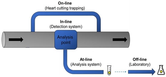 The extraction technologies can be coupled with detection techniques in various ways, depending on the degree of software/hardware automation and human intervention [23]. Accordingly, Figure 1 illustrates the coupling forms, classifying them as off-line, at-line, in-line, and on-line.
