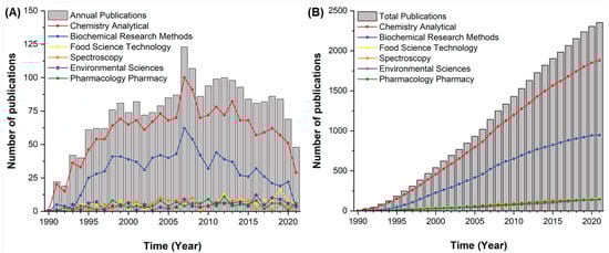In the 32 years of publications in this field, a total of 2353 papers were produced, arranged in six main research areas according to the Web of Science categories: “Chemistry Analytical”, “Biochemical Research Methods”, “Food Science Technology”, “Spectroscopy”, “Environmental Sciences”, and “Pharmacology Pharmacy”. These categories played an essential role in the development of this subject. Since the beginning of publications, the Chemistry Analytical area led the ranking, followed by Biochemical Research Methods. The other areas of the top six have a similar number of papers, and they change positions in the ranking over the years. The Food Science Technology area currently occupies the third position, with 158 articles. Fourth, it is the Spectroscopy area with 146. Environmental Sciences is in fifth with 145, and in sixth is Pharmacology Pharmacy with 143. The Environmental Sciences area is currently in evidence due to increased environmental concerns.