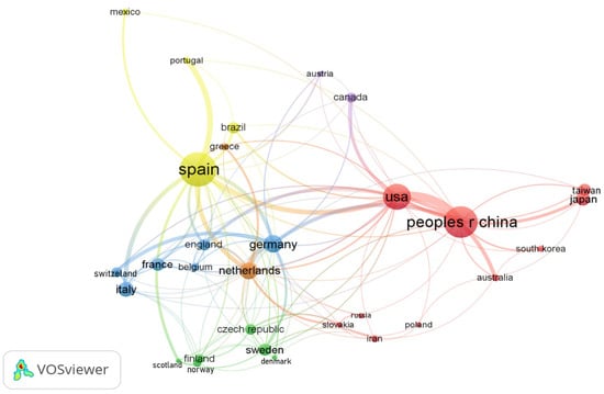 Spain, China, and the USA significantly contributed to this research field, with 19.29%, 17.30%, and 11.81% of the scientific recordings, respectively. These countries published a considerable number of scientific articles collaboratively with other countries. However, when analyzing the number of international collaborations, the rank varied as follows: the USA started as the leader, having published in partnership with 32 countries, followed by Spain, with 31 countries; the third country is Germany, which collaborated with 24 countries. Finally, China dropped to the fourth position, with 23 international collaborations.