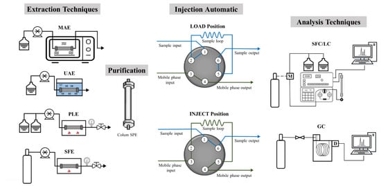 Among the extraction techniques for liquid samples, SPE is the most common in combined systems [7,13]. In SPE, the compounds dissolved or suspended in a liquid mixture are extracted using an interface coupled or not with solid extraction techniques and chromatography [49]. Otherwise, the solid matrix analytes are first extracted through polar or nonpolar solvents before the analysis. The most common on-line extraction systems for solid samples are SFE, UAE, MAE, and PLE. The coupling is usually performed with the aid of multiport valves. In cases where the extracts have a high content of soluble solids or a high concentration of impurities, SPE is used for in-line purification [50]. Figure 4 shows a simplified diagram of the primary extraction and analysis techniques for on-line coupling.