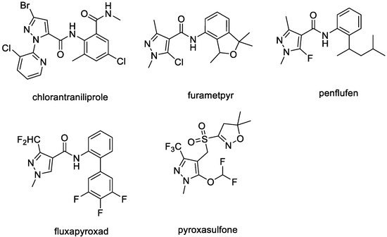 - Du, S.-J.; Li, Z.-H.; Tian, Z.-M.; Xu, L. Synthesis, antifungal activity and QSAR of novel pyrazole amides as succinate dehydrogenase inhibitors. Heterocycles 2018, 96, 74–85. [Google Scholar] [CrossRef]