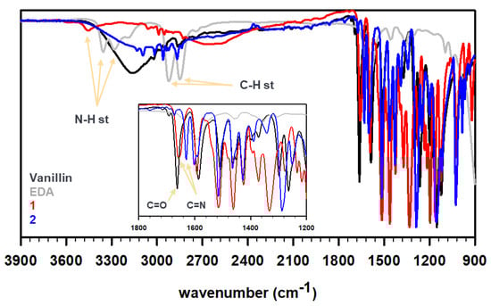 FT-IR profiles of vanillin (black), ethylene diamine (gray), and as-synthesized Schiff bases 1 (red) and 2 (blue).