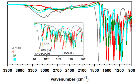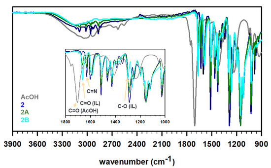 FT-IR profiles of acetic acid (dark gray), as-synthesized Schiff base 1 (red) or 2 (blue), 1:1 acetate IL 1A or 2A (olive), and 1:2 acetate IL 1B or 2B (cyan).