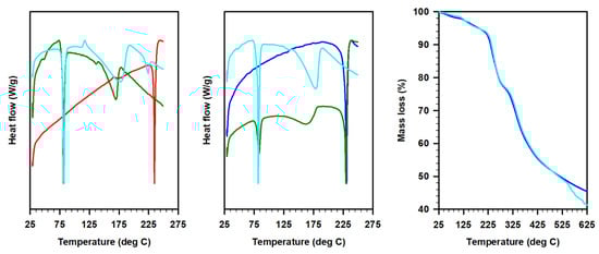 Differential scanning calorimetry and thermal gravimetric analysis plots of Schiff bases 1 (red) and 2 (blue) and respective ILs; 1:1 Schiff base/acetate (olive, 1A or 2A) and 1:2 Schiff base/acetate (cyan, 1B or 2B).