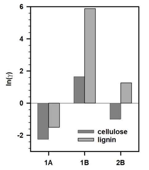 Activity coefficients of cellulose (dark gray) and lignin (gray) in IL 1A, 1B, and 2B.