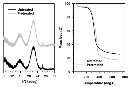 (left) Powder X-ray diffraction and (right) thermal gravimetric analysis, of untreated (black) and IL 2B pretreated (gray) sorghum biomass.