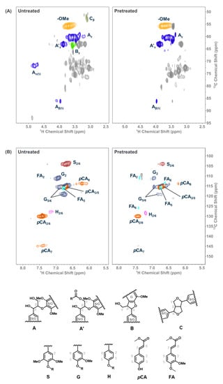 (A) Side-chain and (B) aromatic regions in the 2D HSQC NMR spectra of untreated (left) and pretreated (right) sorghum.