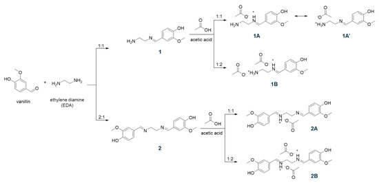 The reaction of an amine with an aldehyde (or ketone) to form an imine via carbinolamine formation was reported by Hugo Schiff, in 1864, as a new series of organic bases [30]. Since then, these imines, also known as Schiff bases, have been investigated in wider contexts including catalysis and bioactive molecules. In the present study, building upon the ease of synthesis, we employed renewable lignin-derived vanillin as an aldehyde precursor, with ethylene diamine (EDA) as an amine source. To obtain vanillin-based Schiff bases, an aqueous solution of vanillin was slowly added to the cold aqueous solution of EDA to dissipate any immediate heat formation. The presence of two amines in EDA offers an opportunity for two unique Schiff bases 1 and 2 simply by the addition of 1 and 2 equivalents of vanillin, respectively, as indicated in Scheme 1. The products were obtained in quantitative crude yields as high melting yellow solids (melting points > 230 °C) after filtration and drying in air.