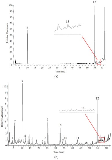 We analyzed samples of PM and PMP with a UHPLC-QE/MS in both positive and negative ion modes. The representative basic peak chromatograms (BPCs) corresponding to negative signals generated by PM and PMP are shown in Figure 1. Details of the identified constituents are listed and presented in Table 1. Analysis showed that 13 constituents in PM exhibited different degrees of changes in PMP.