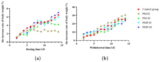 Results are shown in Figure 2. In the control group, there was a steady increase in body weight. From day 2 to day 6 of PM-H, the increase rate of body weight increased slowly. From day 7 to day 14 of PM-H, the rate of increase in body weight did not change significantly. Rats in the PM-M group showed an increase in weight from day 2 to day 11 although this decreased slightly from day 12 to day 14. The body weight of rats in the PMP-H group also increased but was marginally lower than that of rats in the control group from day 12 to day 14 of administration. The increase in body weight in rats from the PMP-H group also increased and was slightly higher than that of the control rats from day 12 to day 14 of administration (Figure 2a).