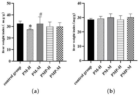 Liver weight index after drug administration (a); liver weight index after drug withdrawal (b); * significantly different from the control group, (p < 0.05); # significantly different from the PM-H, (p < 0.05).