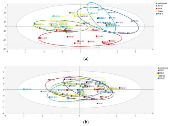 The distribution area reflects the difference in the feces chromaticity. The overlapping distribution areas indicated no difference in feces, and the drug did not significantly affect feces. If the distribution area is scattered, there is a difference in the feces, and the drug substantially affects the feces. As shown in Figure 4a, the distribution areas of color difference values of the PMP-M and the control group overlapped, thus indicating that PMP-M treatment had little effect on the feces of rats. The PM-H, PM-M and PMP-H groups were far away from the distribution area of the color difference value for the feces of rats in the control group, thus indicating that the three groups had significant effects on the feces of rats. There was considerable overlap in the distribution area of color difference between the PM-M and the PMP-H groups, thus indicating that they had a similar effect on rat feces. The fecal chromaticity value of rats in the PM-H group was distributed in a single area; there was almost no overlapping area with other groups, thus indicating that the PM-H treatment had a significant effect on rat feces and was affected in different ways when compared to other drugs or doses.