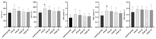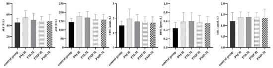 As shown in Figure 3, compared with the control group, the liver weight index of rats in the PM-H group decreased significantly (p < 0.05); there were no significant differences between the other groups and the control group. Compared with PM-H rats, the liver weight index of PM-M was increased significantly (p < 0.05); this suggested that the administration of PM-H reduces liver weight. There was no significant difference in liver weight index after drug withdrawal, thus suggesting that the liver injury caused by the drug was repaired after stopping administration.