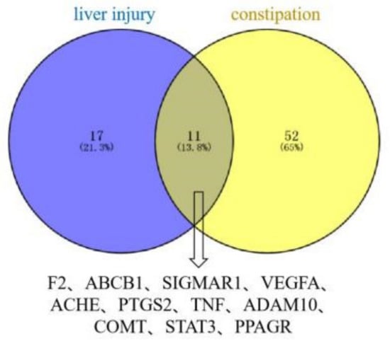 The constituents involved in constipation and liver injury were visualized by Venny 2.1.0 online analysis tool (https://bioinfogp.cnb.csic.es/tools/venny/) (accessed on 24 July 2022), and then the target proteins of the selected constituents causing liver injury and constipation were visualized.