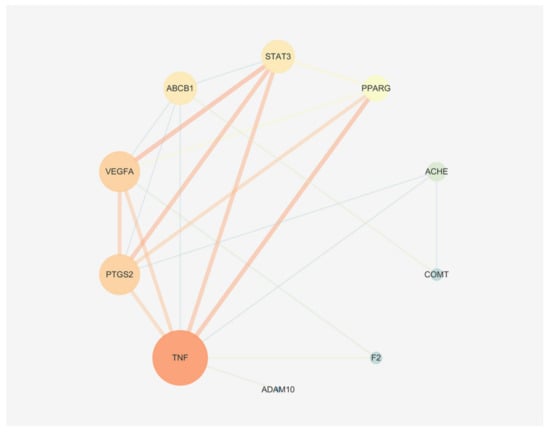 The PPI network diagram contained ten nodes and 24 edges (Figure 11), thus indicating a synergistic regulatory relationship between the intersectional targets of the screened intersectional constituents regulating liver injury and constipation rather than a single action regulation. CytoNCA topological analysis revealed target degree values in the following order: TNF > PTGS2 > VEGFA > STAT3 > F2 > ABCB1 > PPARG > ACHE > COMT > ADAM10.
