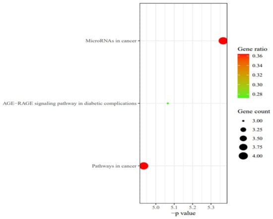 KEGG analysis of eleven core targets was performed by Meta scape; we identified three pathways according to p values: pathways in cancer, microRNAs in cancer, and AGE-RAGE signaling pathways in diabetic complications (Figure 13).