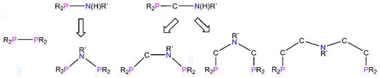 The following review will provide a brief update, from the Author’s perspective, of selected examples of chelating diphosphines with a central nitrogen functional group in the backbone and illustrate the diverse behaviour(s) imparted by this additional donor atom. The focus will be on ligand design and synthesis protocols, 31P{1H} NMR spectroscopy as a useful tool for assessing purity and characterisation and an illustration of how such ligands are used, primarily in coordination chemistry and catalysis. This review is by no means exhaustive but will highlight the growing emergence of these ligands versus their all-carbon backbone counterparts which historically have been known for several decades. Depending on the diphosphine ligand, 4-, 5-, 6- (Figure 1) and larger chelate/macrocyclic rings with one (or more) –NH–/–NR– sites are formed upon complexation to a range of typical transition metals. The present review aims to embrace the Reader with a perspective of the importance of these ligands and their continuing prominence going forward. These ligands constitute important families to the already extensive number of known phosphorus compounds. As will be illustrated, the tuneability of phosphines thereby precisely controlling properties such as electronic effects, sterics, asymmetry, solubility, chirality etc is applicable to the diphosphines discussed here.