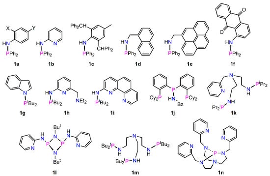 The ligand 1a (Figure 2), bearing a phenyl substituent (X = Y = H), has been known for over 25 years [9] and related analogues have been described [10]. The pyridyl analogue, 1b, was first reported in 2000 by Woollins and co-workers and prepared from 2-aminopyridine, NEt3, and ClPPh2 at 0 °C and isolated as a white powder in 78% yield [11]. Reaction of an in situ generated lithiated amide, with 1 equiv. of Ph2PCl, afforded air stable 1c as a white solid in 66% yield and showed a 31P signal at 38.5 ppm [12]. A single crystal X-ray structure analysis of 1c revealed a P–N distance of 1.702(13) Å. Ligand 1c could function in a P-monodentate fashion, but also through one of the phenyl rings on the benzhydryl group as a tethered η6-arene when bound at a Ru(II) piano-stool centre. Pope and co-workers [13] prepared a range of fluorescent phosphinous amides 1d–f from a stoichiometric reaction of the appropriate primary amine:ClPPh2 in CH2Cl2, and NEt3, at 0 °C. It was found that 1d–f could be isolated as colourless, yellow oils or as a dark orange solid and showed 31P signals at 42.2, 42.1, and 26.1 ppm, respectively. These ligands were coordinated to gold(I) and displayed interesting photophysical properties. In 2022, unlike conventional pathways to phosphinoamines (Route A, Scheme 1) previously highlighted, an electrochemical route has been reported as an alternative strategy for generating P–N bonds. For example, 1g could be accessed through coupling of secondary amines/phosphines and concomitant H2 evolution [14]. Utilising a single P–N bond forming step has successfully enabled the preparation of PN2-tridentate ligands such as 1h and 1i [15,16] which have subsequently been widely studied in various catalytic transformations via metal ligand cooperative catalysis. The synthesis of 1h was accomplished using NEt3/nBuLi, tBu2PCl, and 6-[(diethylamino)methyl]pyridine-2-amine. The tridentate phosphinoamine, 1j, was prepared from Cy2PCl and BzNH2 in C7H8, in the presence of excess NEt3, and was isolated as a colourless solid in 69% yield [17]. The 31P NMR of 1j showed one resonance for the PN atom at 32.6 ppm (as a dd) and −12.6 ppm (as a d for the -PCy2 groups, Table 1). Other multidentate ligands, such as 1k [18], were synthesised by reaction of (2-C5H4N)CH2N(CH2CH2NH2)2 with 2 equiv. of iPr2PCl in THF in the presence of excess NEt3 to afford the desired product as a pale yellow oil in 88% yield and a 31P NMR at 63.9 ppm (in C6D6). P–N formation can be accomplished, through condensation, upon reaction of 2-aminopyridine and [ClP(μ-NtBu)]2 in the presence of excess NEt3, in THF, to afford 1l as a colourless crystalline solid in 32% yield. The 31P NMR spectrum showed a signal at 106.4 ppm whilst single crystal X-ray analysis revealed an intramolecular N–H…N H-bond spanning the P2N2 four-membered core [19]. The tripodal phosphinoamine 1m [20,21] was readily prepared from N(CH2CH2NH2)3 and tBu2PCl (3 equivs) in THF in the presence of DBU and isolated as a colourless oil in 95% yield and with a 31P NMR signal at 77.9 ppm (in C6D6). The three NH sites could further be readily deprotonated, with nBuLi and quenched with GaCl3, to form a corresponding Ga compound. The ligand 1n (abbreviated as TPAP) was synthesised from reaction of tris[2-[N-(2-pyridinemethyl)-amino]ethyl]amine and ClP(NMe2)2, which upon subsequent deprotonation with excess tBuOK in THF gave 1n as a white solid which displayed a 31P resonance at 126 ppm [22,23].