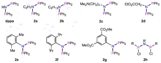 Small bite-angle diphosphines such as the ubiquitous dppm [bis(diphenylphosphino)methane] have attracted much interest over the years as an excellent chelating or bridging ligand for mononuclear and polynuclear metal centres. Closely related to dppm, namely dppa [bis(diphenylphosphino)amine, Figure 3], has also been widely studied as an excellent coordinating ligand [27,28,29,30]. One further attractive advantage of dppa, over dppm, is the ease by which it is possible to further functionalise the central amine with a range of different substituents and some highlights to demonstrate this behaviour will be reviewed here. The diphosphine, dppa, can readily be synthesised from ClPPh2 and (Me3Si)2NH and isolated as a white solid [31].