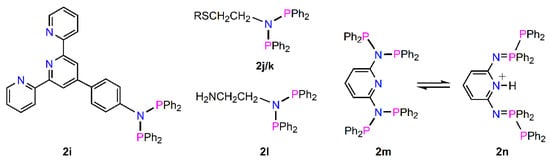 Routes to increasing donor functionality in PNP ligand systems have been realised through the works of several groups. Balakrisna and co-workers [44] described a new terpyridine based diphosphinoamine 2i (Figure 4) prepared from reaction of the parent amine and ClPPh2, in CH2Cl2 and the presence of NEt3. The phosphine 2i was isolated as a colourless solid in 48% yield and displayed a characteristic 31P resonance at δ 69.3 ppm (in CDCl3). From a single crystal X-ray analysis, the two P–N bond distances are 1.713(2) and 1.721(2) Å with a P–N–P angle of 114.46(12)°. The sum of the angles around the nitrogen centre is 359.77° indicating a planar geometry. Diphosphine 2i was shown to exhibit various ligating motifs (P,P-chelate, P,P-bridging, or as a multidentate system using all P2N3 donor atoms). Braunstein and co-workers [45,46] prepared a series of bis(phosphino)amines, including the thioether ligands 2j and 2k [R = PhCH2, CH3(CH2)5]. These were prepared from the corresponding primary amines and ClPPh2, in the presence of NEt3, in Et2O at 0 °C. Both 2j and 2k showed a single peak at δ 62.9 ppm in their 31P{1H} NMR spectra and both ligands could be used to afford heterodinuclear and trinuclear metal complexes through P2S-binding. Roodt and co-workers [47] developed new pathways to potentially water-soluble P–N–P ligands such as 2l. Hence, the N-Boc ligand was synthesised from the free primary amine and ClPPh2, in CH2Cl2, in the presence of NEt3. The product was isolated as a white solid in 81% yield and the 31P showed a signal at 63.8 ppm (in CD2Cl2). This ligand could be “protected” by coordination to an {Re(CO)3} fragment, whereupon the protecting group was removed with CF3CO2H followed by neutralisation to give a free pendant amine site.