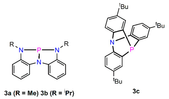 Radosevich and co-workers [55] reported the synthesis of two phosphorus triamides 3a/3b (R = Me, iPr, Figure 5) from the reaction of triamines and PCl3 and NEt3 in a mixed THF/Et2O solvent to give 3a in 80% yield as an off-white solid. The N-propyl analogue, 3b, was prepared in 83% yield. For 3a the observed 31P shift was at 159.8 ppm and the P–N distances were found to be 1.7014(14) Å and 1.7190(13) Å whereas the pseudoaxial nitrogen was longer [1.7610(12) Å]. The synthesis of an unusual 10-aza-9-phosphatriptycene, [56] was achieved by reaction of the brominated tertiary amine and tBuLi, followed by addition of (ArO)3P (1 equiv) to give 3c in 71% yield and whose 31P displayed a signal at −77.0 ppm.