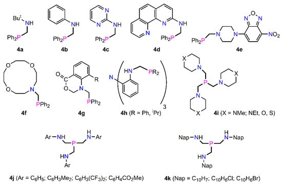 The synthesis of tripodal aminomethylphosphines, 4i [67], 4j [68,69,70,71,72,73] and 4k [74] have successfully been achieved through threefold condensation using P(CH2OH)3 and three equiv. of the appropriate amine, either in dynamic vacuum or using toluene as solvent in an azeotropic distillation to remove water. For 4k, the use of [P(CH2OH)4]Cl as a P(V) precursor and reaction with 4 equiv. of amine afforded the corresponding tetraaminoalkylphosphonium salts, followed by reduction with tBuOK, gave the tripodal ligands in >85% isolated yields.